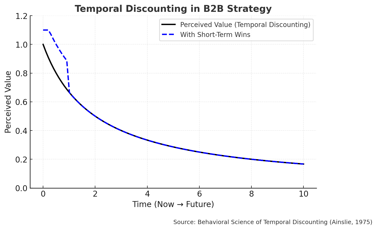 Commercial strategy provides a clear lens. Take enterprise software pricing. Many SaaS companies know their platform will save clients millions over several years — but that future payoff won’t close the deal alone. Salesforce, for example, accelerates adoption by emphasizing immediate ROI metrics like “time saved per rep” or “deals closed faster” in the first quarter of use. By collapsing future benefits into short-term wins, they overcome the tendency of B2B buyers to discount value that only shows up down the road.